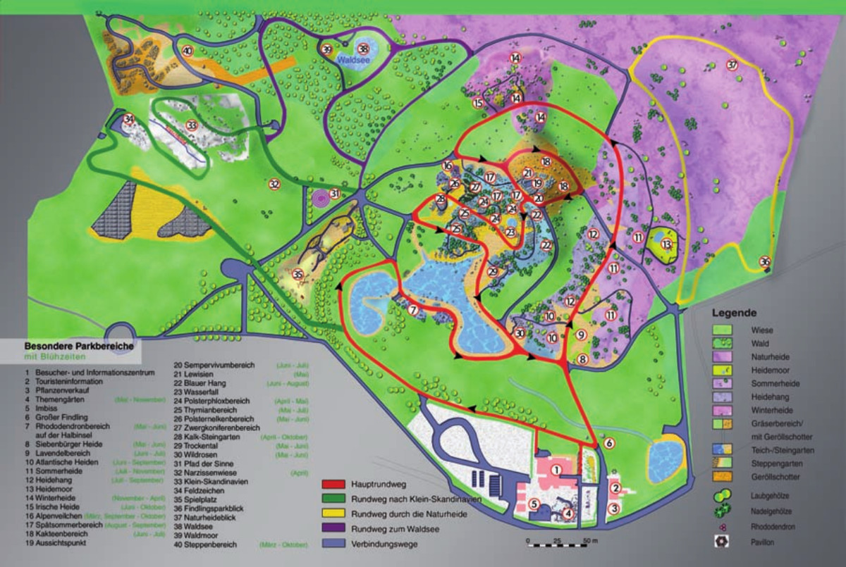 Das Parkerlebnis über Brücken und Hügel, vorbei an Bächen und Wasserkaskaden, durch Steingärten und Heidelandschaft beginnt und endet am modernen Besucherzentrum. In der überdachten Cafeteria -umgeben von sieben Miniaturgärten -lassen Sie den Parkbesuch entspannt ausklingen.